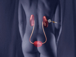 3-D models of urogenital system and catheter superimposed over a photo. Part of a dissolve sequence for a video on personal care for a nephrostomy.